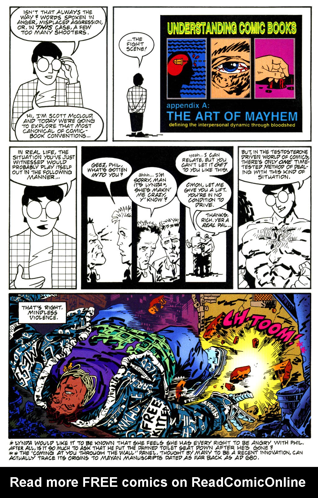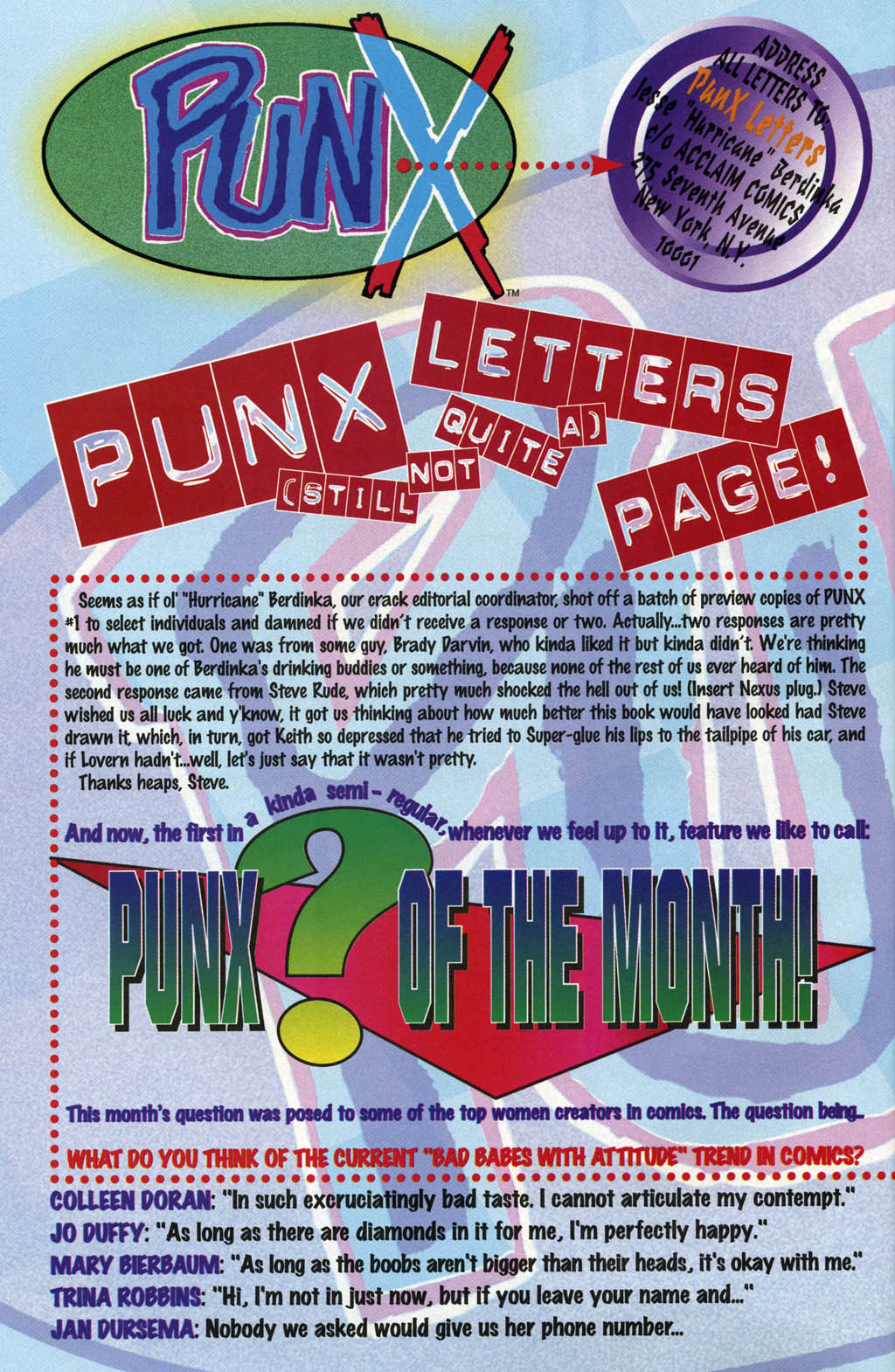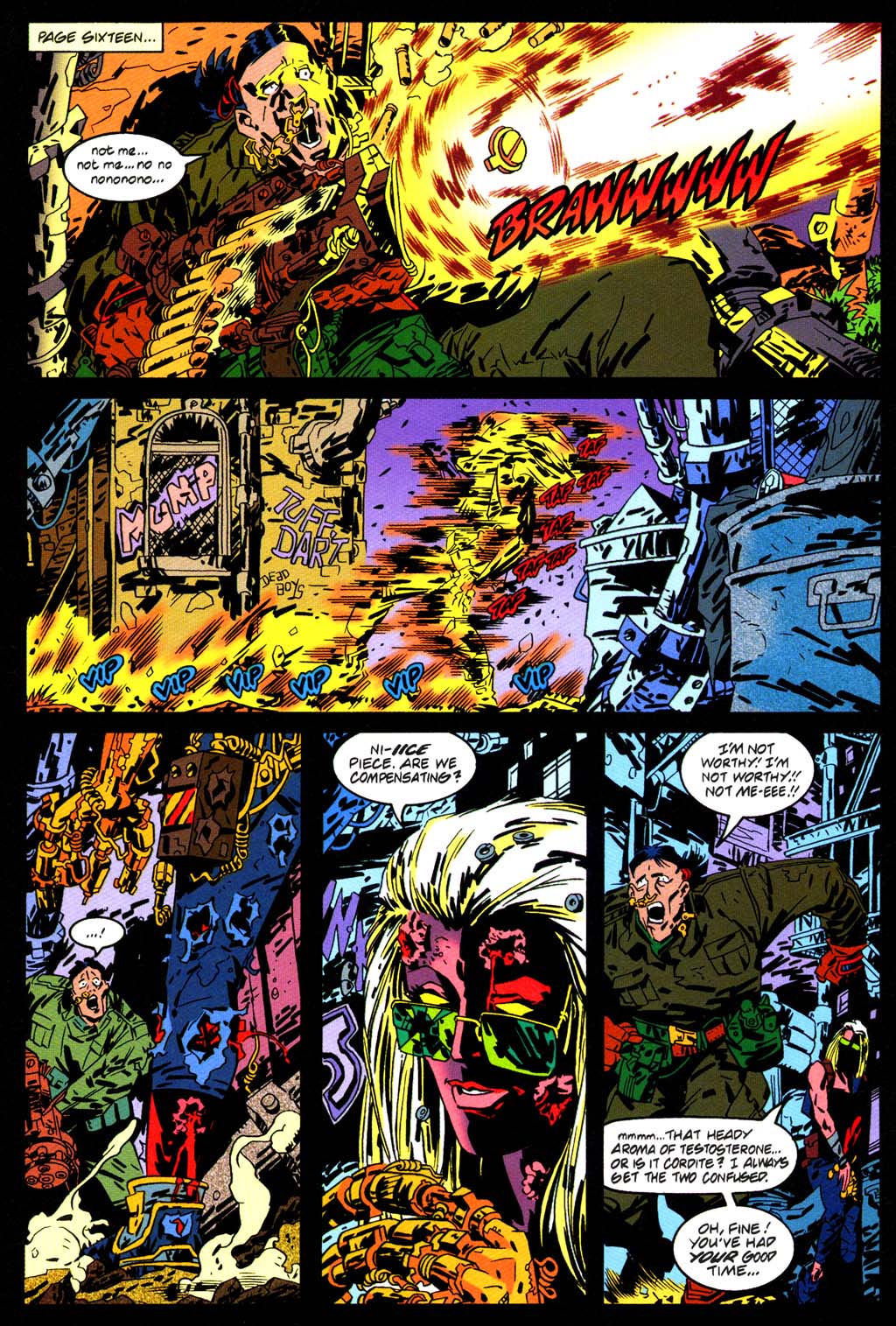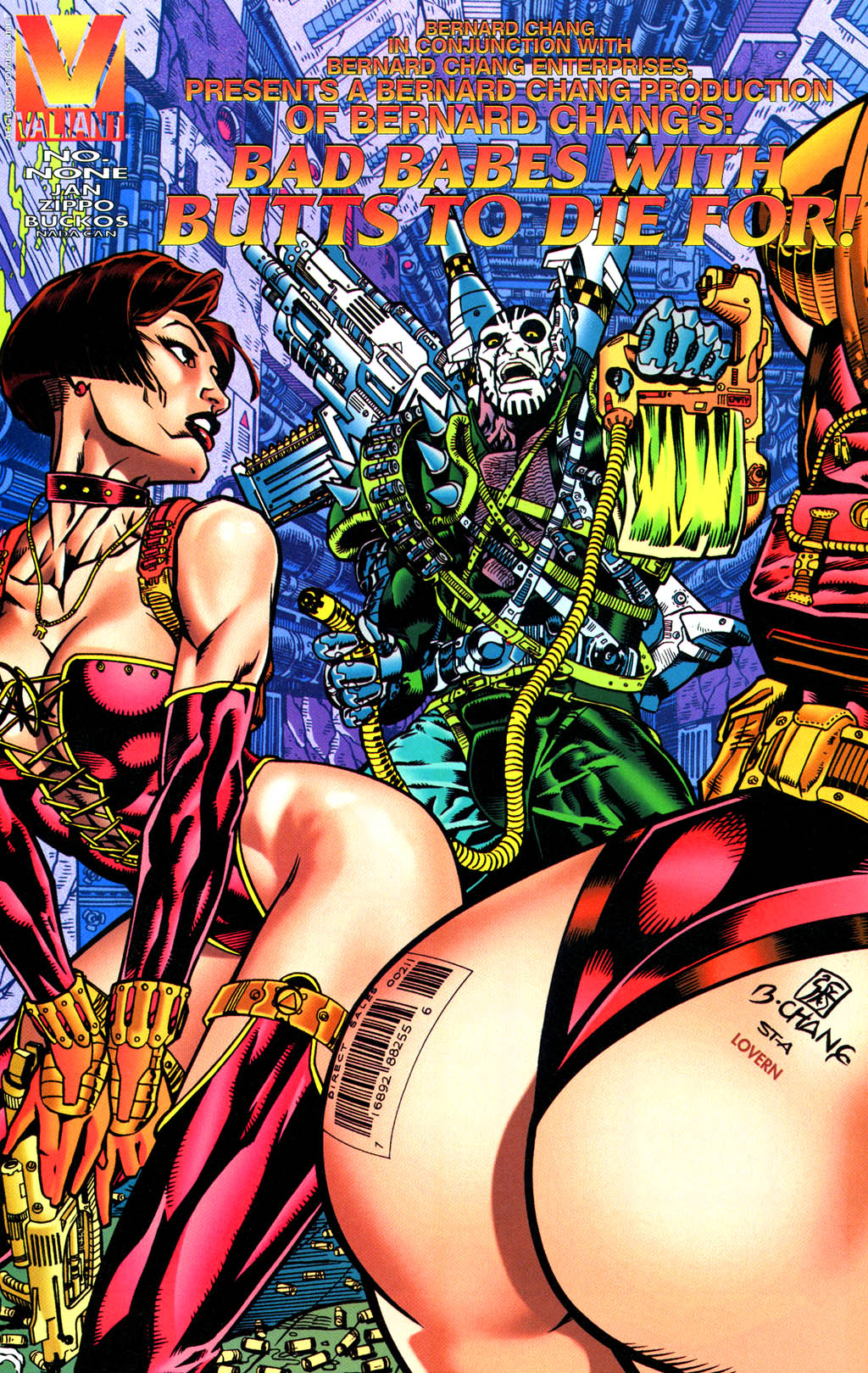 I tredje nummer forflytter handlingen seg plutselig til den ikke-eksisterende Valiant-serien Bernard Chang’s Bad Babes With Butts To Die For, mens brevspalten aldri får et eneste brev. Det er den typen tegneserie. (Første nummer har også en dobbeltsidig spørreundersøkelse hvor leserne blant annet blir spurt om de bruker deodorant, men jeg er usikker på om det er en vits eller om det var sånt amerikanske tegneserieforlag ønsket å vite på 90-tallet).