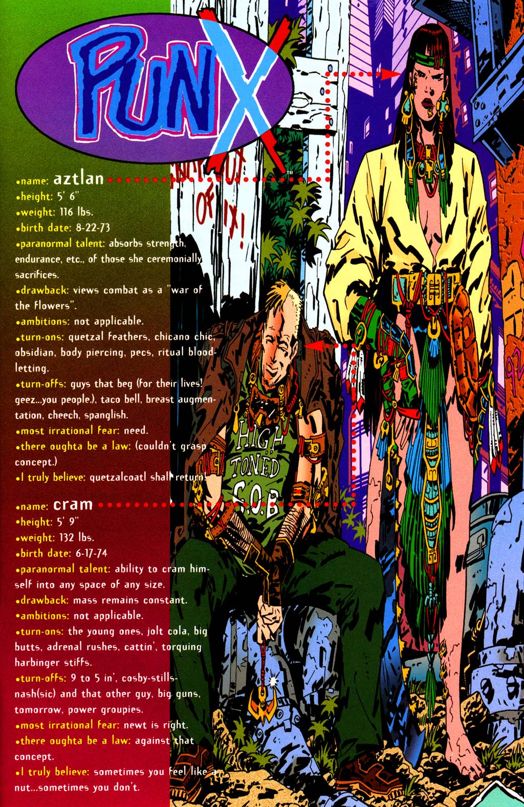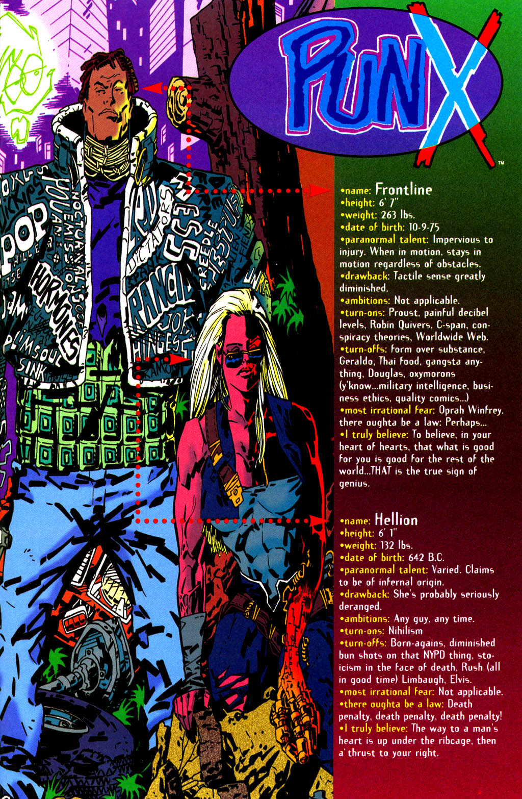 Vel, PunX-bladene dukket opp, og de er et ork å lese. Det jeg så for meg som en smart og underholdende miniserie i samme gate som Giffens “five years later”-utgave av Legion of Superheroes og det ene nummeret han tegnet av Topps Comics’ Kirbyverse-miniserie, viste seg snarere å være et stykke performancekunst: PunX er en karikert og uutholdelig selvbevisst parodi på den typen klisjépregede og langt på vei uforståelige superhelttegneserier som florerte på det amerikanske markedet på midten av 90-tallet – utformet som en klisjépreget og ofte langt på vei uforståelig superhelttegneserie fra midten av 90-tallet.