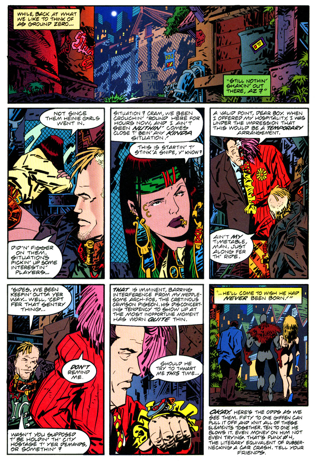 Noen superfigurer slåss mot hverandre, noen forretningsmenn legger planer, vi får litt bakgrunnsinformasjon som ikke følges opp, og så slutter det med følgende klassiker av en i-neste-nummer-tekstboks: “Okay, here’s the odds as we see them. Fifty to one Giffen can pull it off and knit all these elements together. Ten to one he blows it. Even money on him not even trying. That’s PunX #4, the literary equivalent of rubber-necking a car crash. Tell your friends”. PunX #4 kom aldri ut.