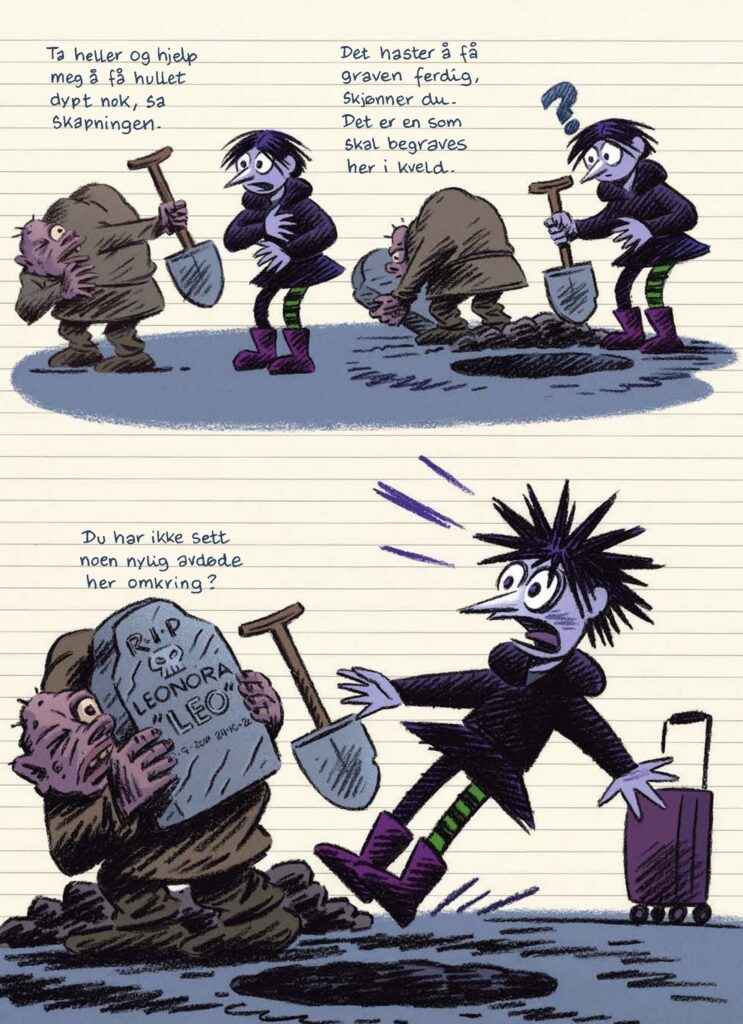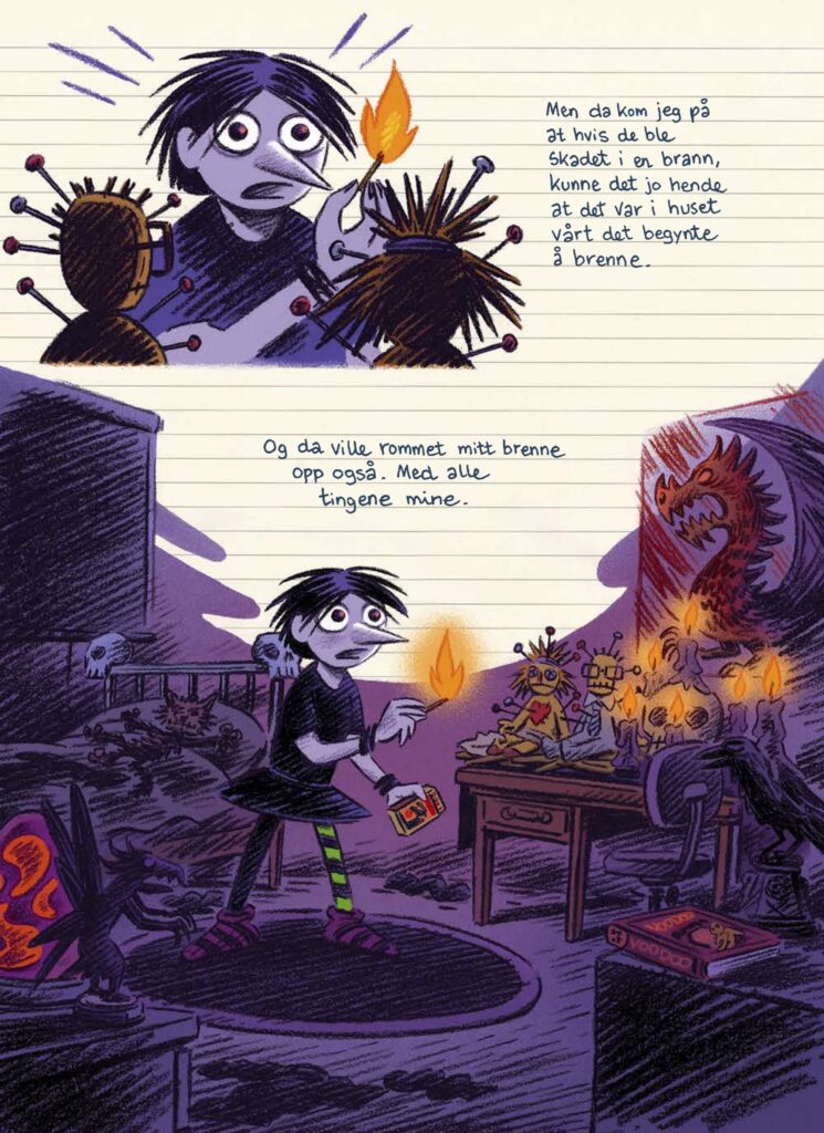 Fargebruken i boka er veldig typisk goth med mye svart, lilla og grønn. De eneste plassene vi får lysere, mer fargerike illustrasjoner, er når Leo illustrerer det som hun mener er kjedelig og streit. Og her må jeg si meg enig med Leo, jeg velger hennes estetikk over foreldrene og fetteren sin hver dag i uka.